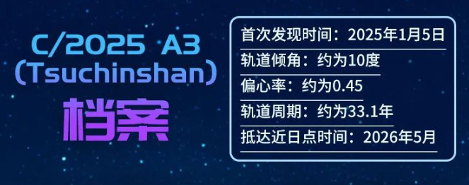 另据消息,中国科学院紫金山天文台1月16日晚通报,国际小行星中心于当日发布了由该台近地天体望远镜观测发现的一颗新彗星彗星C/2025 A3(Tsuchinshan)这是第7颗以“紫金山”命名的彗星。