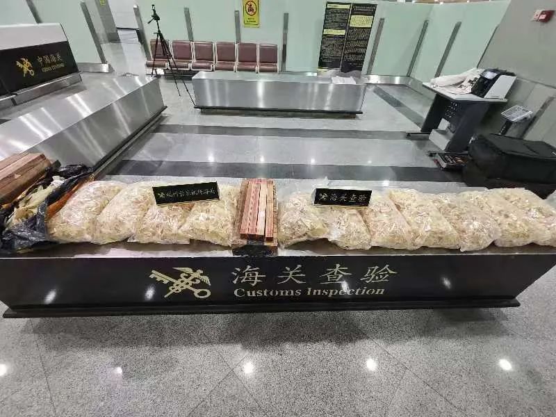 近日,福州长乐机场海关对进境航班进行监管时,发现2名同行旅客行李物品机检图像异常。经开箱查验,从中查获疑似鲨鱼鱼翅12袋,现场称重16.38千克;疑似珍稀木材18件,现场称重30.74千克。
