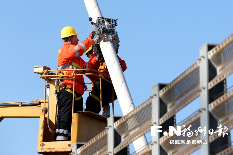 20日上午,阳光洒在海面上,一片波光粼粼。南铁福州工务段平潭大桥工区工长蒋明亮与工友们在200多米的高空上,进行当日的斜拉索检修作业。