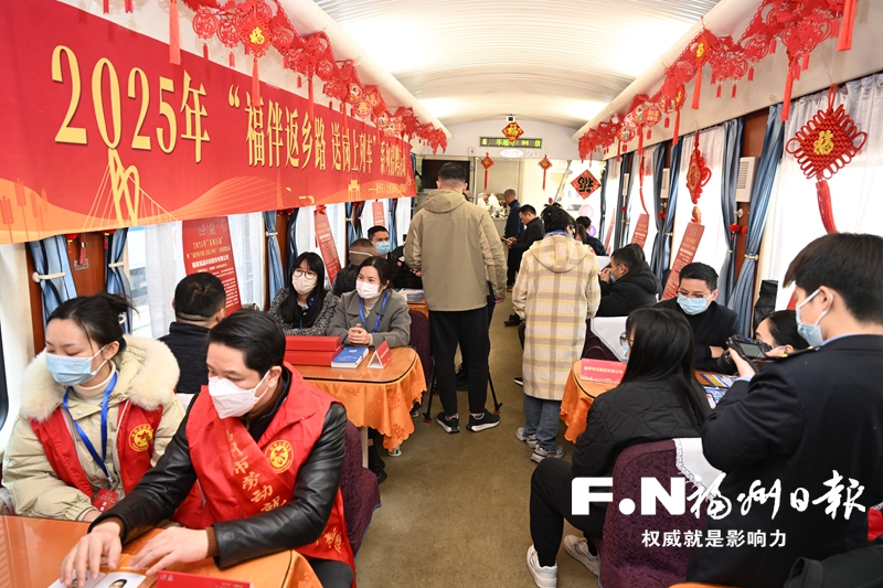 春节将至,又是一年归家时。20日,福州开往成都的Z392次列车上,1000多名旅客踏上回家路。和以往不同的是,车厢里开起形式独特的招聘会——“春风行动”暨“福伴返乡路 送岗上列车”活动,邀请福晶科技、盛辉物流、六和机械等8家重点企业参加,让返乡旅客及时找到满意的工作,安心回家。