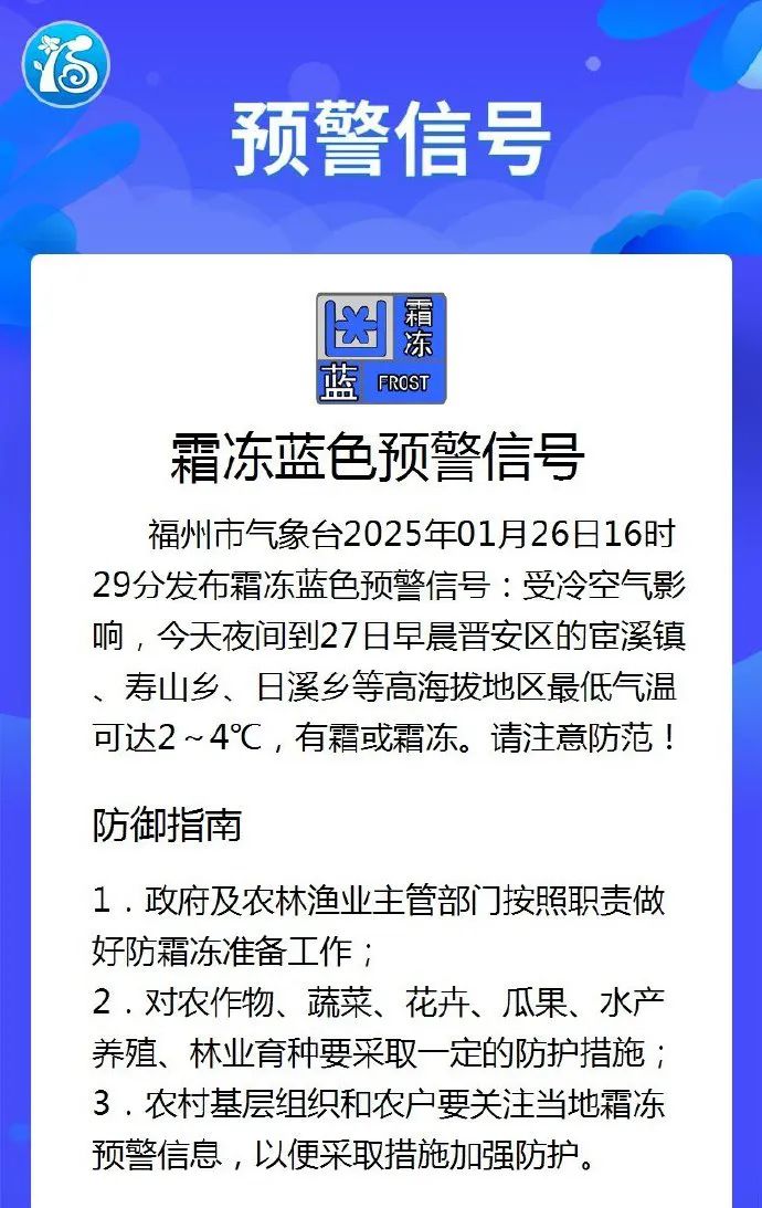 福州市气象台2025年01月26日16时29分发布霜冻蓝色预警信号:受冷空气影响,26日夜间到27日早晨晋安区的宦溪镇、寿山乡、日溪乡等高海拔地区最低气温可达2~4℃,有霜或霜冻。请注意防范!