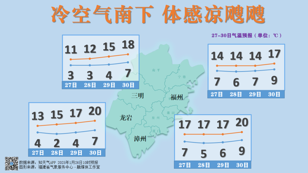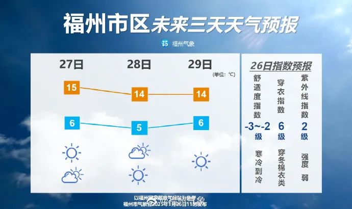 受冷空气影响,26日夜里起,福州气温开始下降,28日至29日夜晨气温较低,30日至31日气温回升。