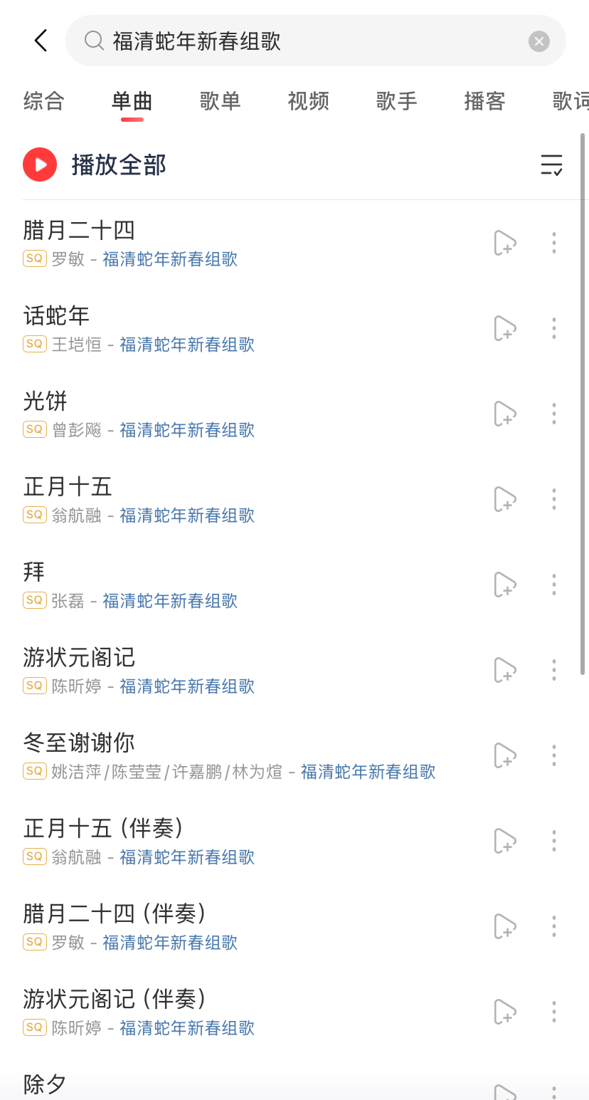 据悉,目前福清蛇年组歌主要下载平台有网易云音乐、QQ音乐、酷狗音乐、酷我音乐。在音乐软件中直接搜索“福清蛇年新春组歌”,就可以下载专辑内的歌曲。
