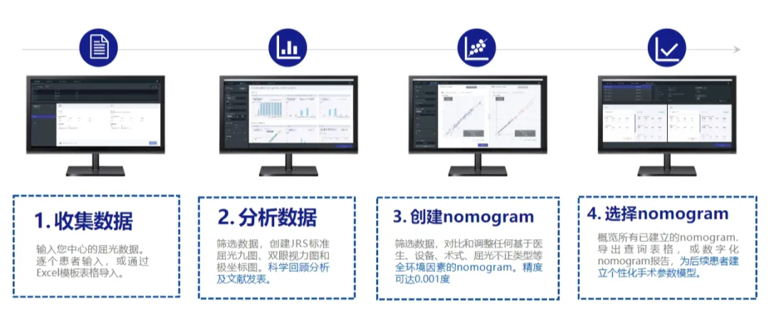 首先会收集患者各方面的数据,随后对数据进行筛选回顾,根据已有结果,进行科学量化回归分析,调整各方面可能影响矫正精度的误差后,针对每位患者进行个性化设计,建立适合患者本人的手术参数模型,将临床效果用标准图表可视化地呈现在医生面前,帮助临床医生做更精细的术前设计,获得更贴近每一位患者适宜的矫正目标值!