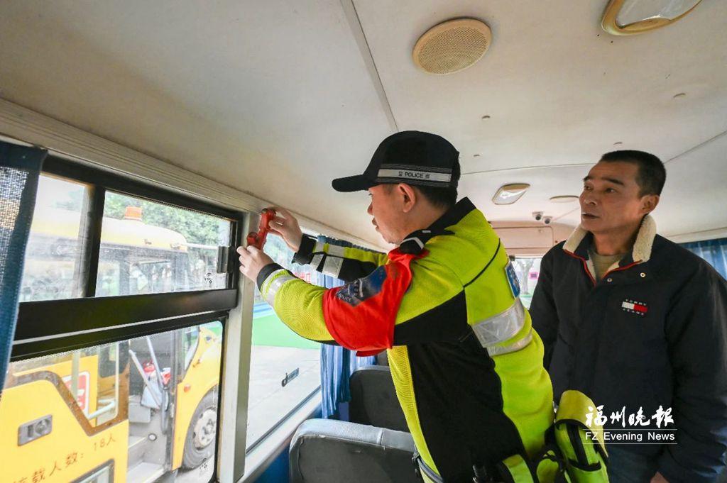据悉,在今年春季开学前夕,福州交警就已行动起来,开展校车安全专项督查行动,检查校车是否具备“四证”,是否落实“每个座位一条安全带”,是否配备干粉灭火器、急救箱、应急锤等安全设备,是否规范喷涂放大牌号,以及统一颜色、粘贴标识等。(记者 肖远强 通讯员 榕交警/文 市公安局交警支队供图)