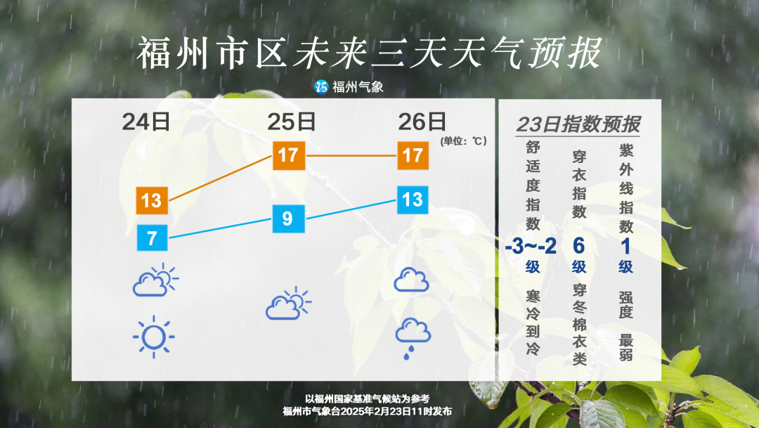 今明两天气温仍然较低,全天体感阴冷,仍要做好防寒保暖的措施。25日起气温将会逐步升高,福州市区的最高气温会升至17℃,最低气温也将相应升高,请适时增减衣物,谨防感冒。