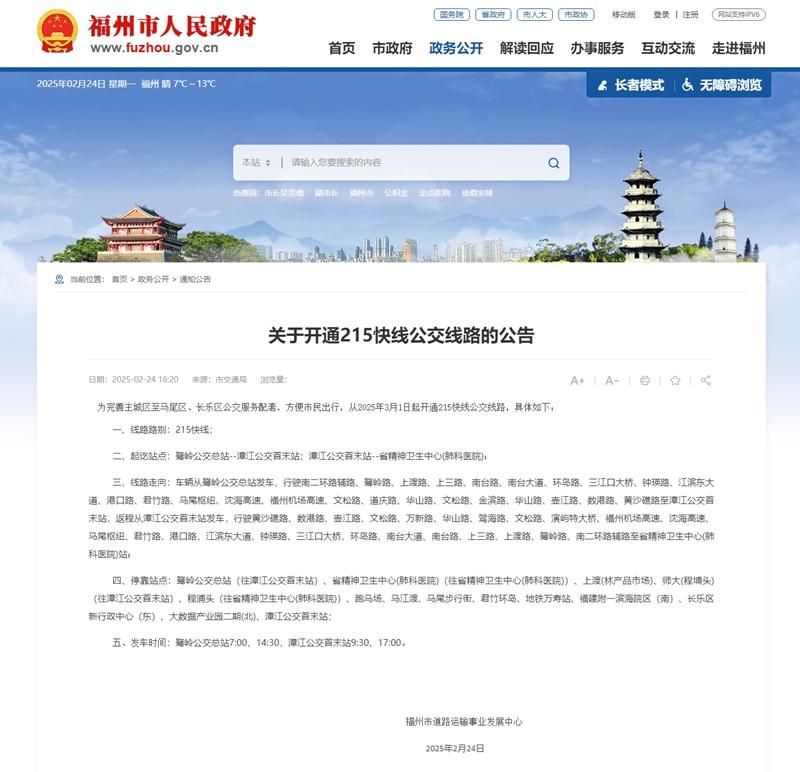 为完善主城区至马尾区、长乐区公交服务配套,方便市民出行,从2025年3月1日起开通215快线公交线路,具体如下: