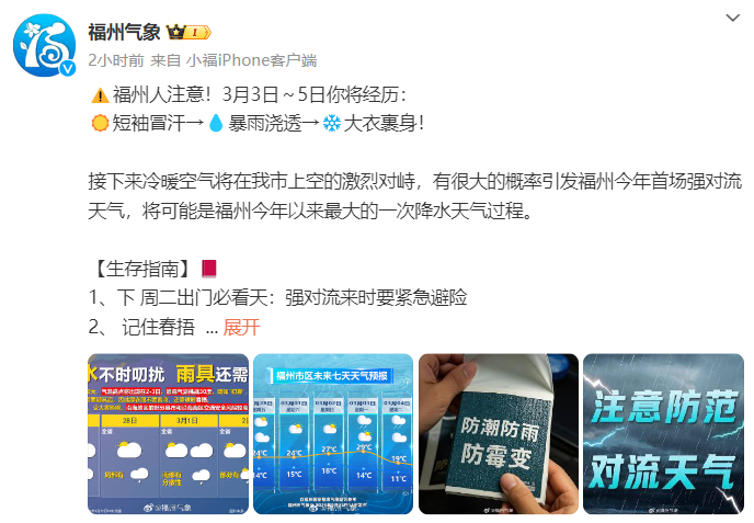 3月3日至5日,福州人将经历短袖冒汗→暴雨浇透→大衣裹身。