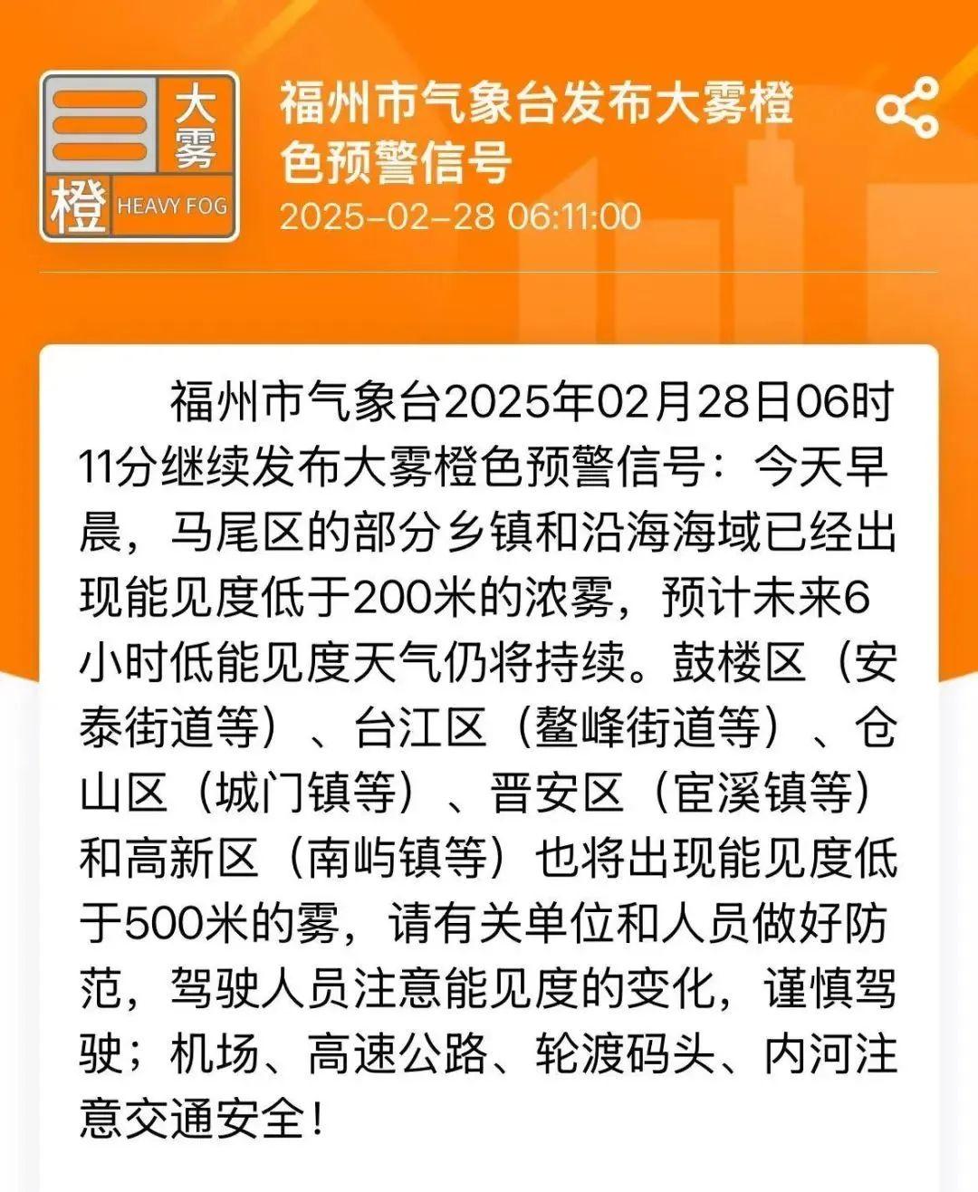 今天早上6时,福州发布大雾橙色预警!部分乡镇能见度小于200米!