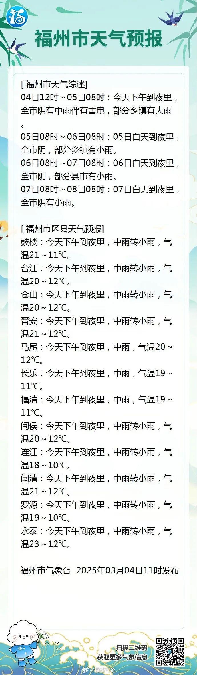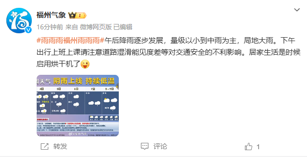 据@福州气象最新消息,午后降雨逐步发展,量级以小到中雨为主,局地大雨。