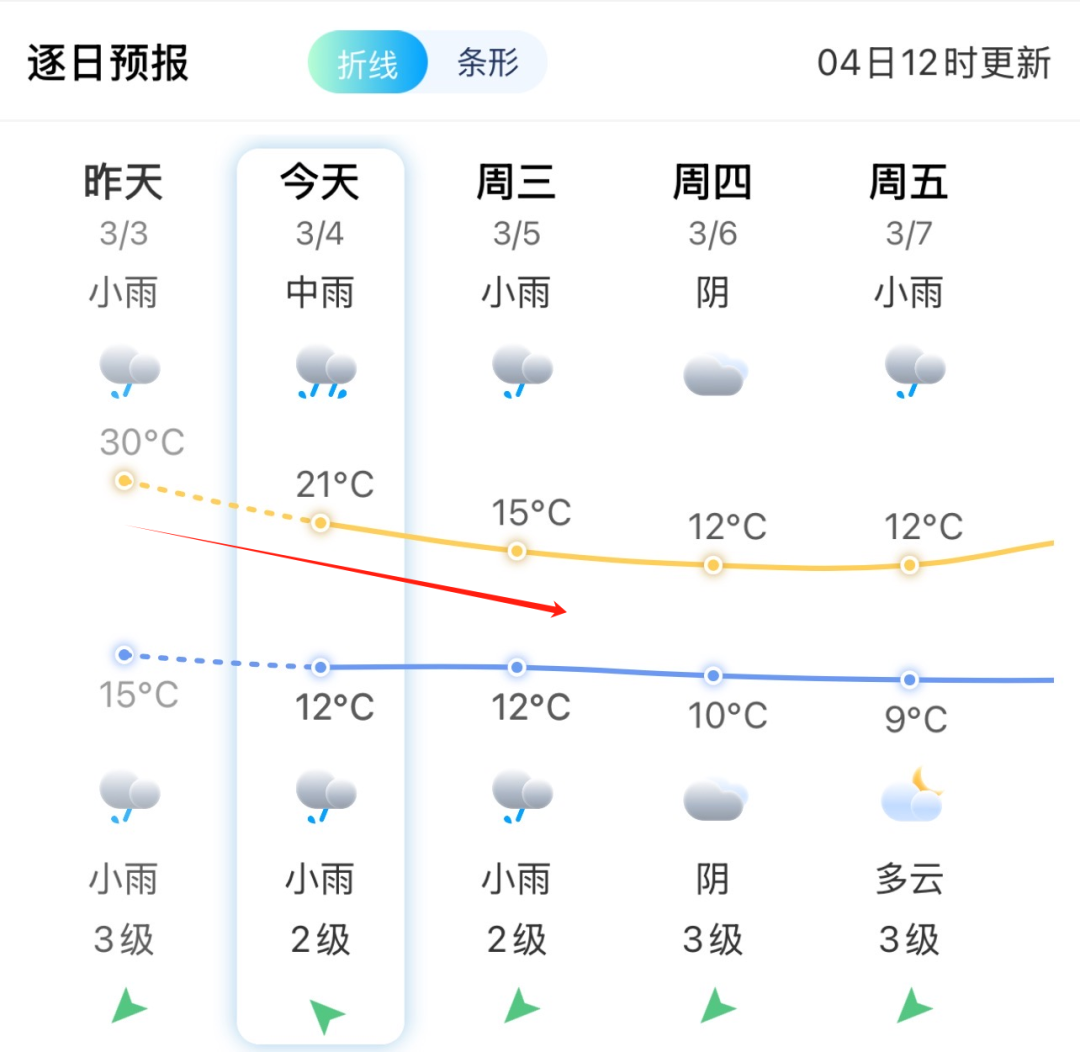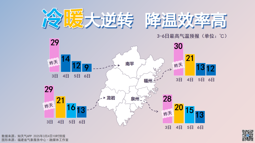 在寒潮和降水影响下,3日夜里福州已经开始降温,4日市区的高温降至21℃左右。受强冷空气影响,5日气温还会进一步下降,短短两天气温降幅超过10℃,周五福州市区的气温只有8~12℃。