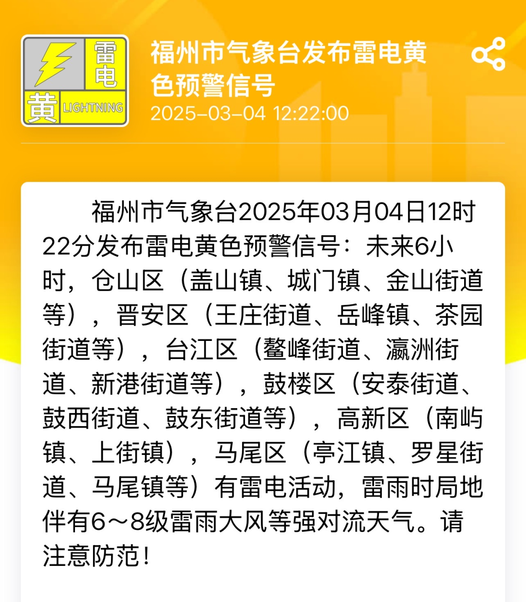 4日12时22分,福州市气象台发布雷电黄色预警信号。
