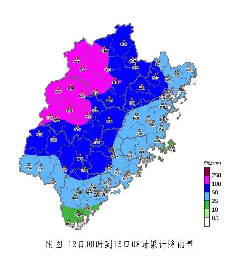 12日傍晚到14日,福建有暴雨和强对流天气,过程累计雨量70~120毫米,局部可达140毫米,最大小时雨量60毫米。
