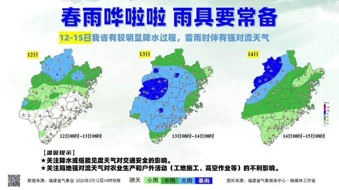 其中,强对流天气主要影响时段为3月12日傍晚到13日,三明大部、龙岩大部、南平(建瓯、建阳、邵武、顺昌、延平、政和)、宁德(福安、古田、霞浦、柘荣、蕉城)、福州(晋安、连江、罗源、闽侯、闽清)、泉州(安溪、永春)、漳州(华安、南靖、平和)的部分乡镇有短时强降水、8~10级大风或冰雹等强对流天气。
