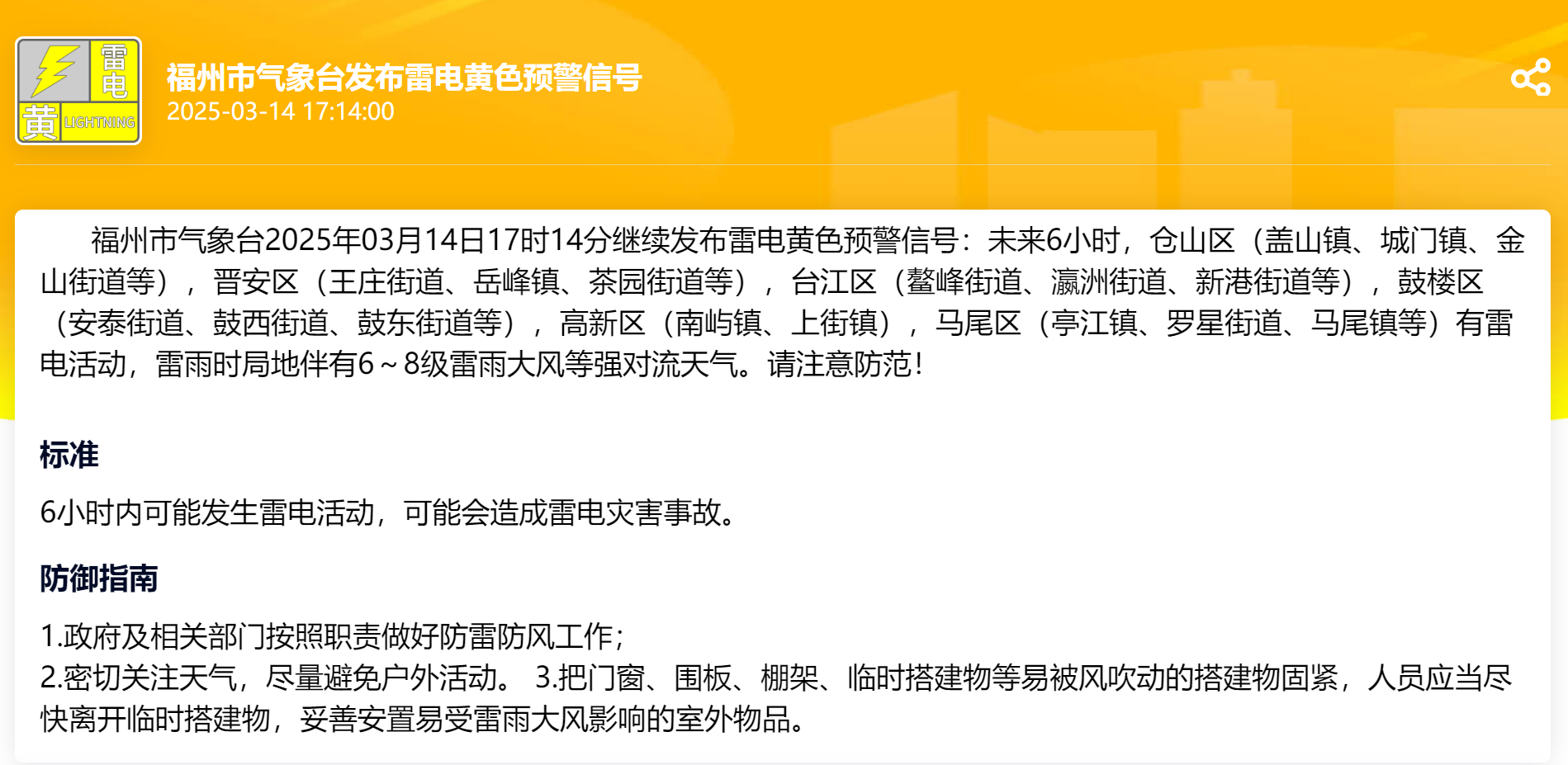 福州市气象台2025年03月14日17时14分继续发布雷电黄色预警信号:未来6小时,仓山区(盖山镇、城门镇、金山街道等),晋安区(王庄街道、岳峰镇、茶园街道等),台江区(鳌峰街道、瀛洲街道、新港街道等),鼓楼区(安泰街道、鼓西街道、鼓东街道等),高新区(南屿镇、上街镇),马尾区(亭江镇、罗星街道、马尾镇等)有雷电活动,雷雨时局地伴有6~8级雷雨大风等强对流天气。请注意防范!