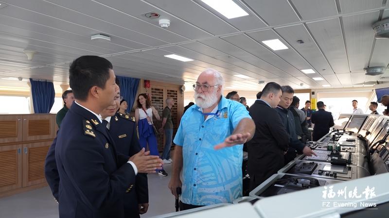 在福州海事局执法人员引导讲解下,60余名会议代表深入了解该轮在海航巡航执法、水上综合指挥、险情事故应急处置、国际交流合作等方面发挥的作用。