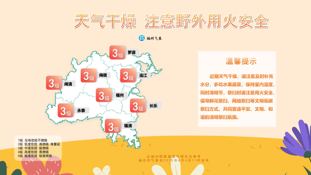 (三)近期福州降水偏少,且适逢清明假期,森林火险气象等级高,请特别注意用火安全。清明祭扫高峰将至,请尽量选择公共交通,林区扫墓严禁明火,文明祭祀共同守护榕城蓝天。
