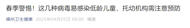 春回大地,万物复苏,但春季也是呼吸道传染病的高发季节。对于免疫力相对较弱的低龄儿童来说,托幼机构是他们聚集的场所,更容易发生呼吸道传染病的传播。福州疾控提醒:近期,鼻病毒、人偏肺病毒、呼吸道合胞病毒等呼吸道传染病在低龄儿童中较为常见,为了保障孩子们的健康,托幼机构需要高度重视并采取有效措施进行预防。