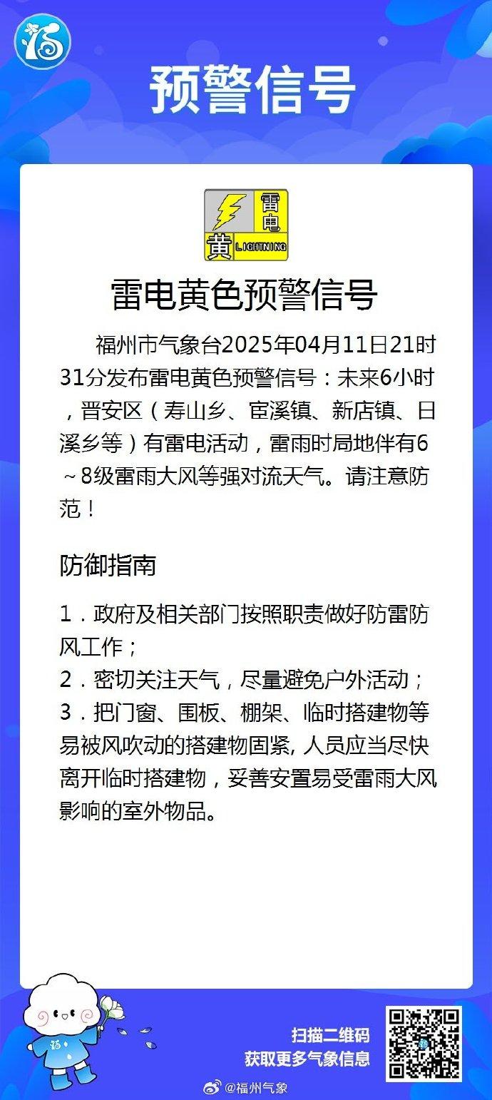 福州市气象台2025年04月11日21时31分发布雷电黄色预警信号:未来6小时,晋安区(寿山乡、宦溪镇、新店镇、日溪乡等)有雷电活动,雷雨时局地伴有6~8级雷雨大风等强对流天气。请注意防范!