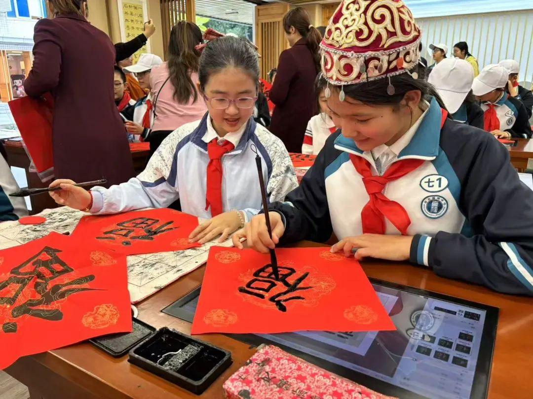 在福州教育学院附属第二小学“点墨轩”,两地少年共同挥毫泼墨,书写象征吉祥的“福”字。他们还手工制作“福”字胸章,传递美好祝福;体验非遗掐丝珐琅发簪制作,用3D建模技术设计出闽疆特色建筑模型。