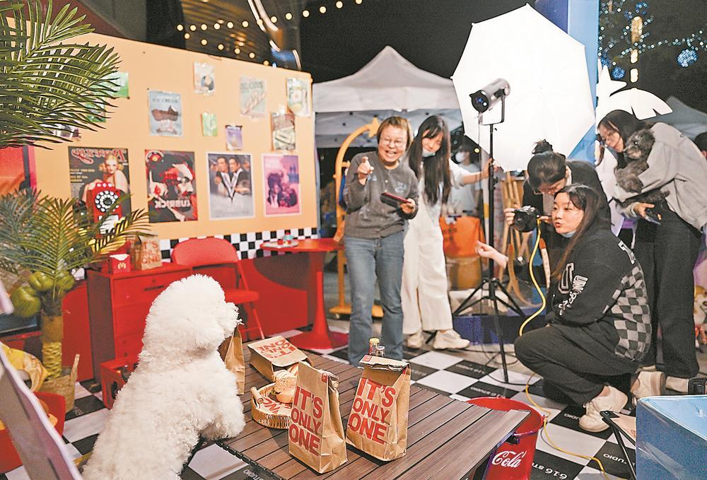 市集上,市民在引导宠物拍摄写真。