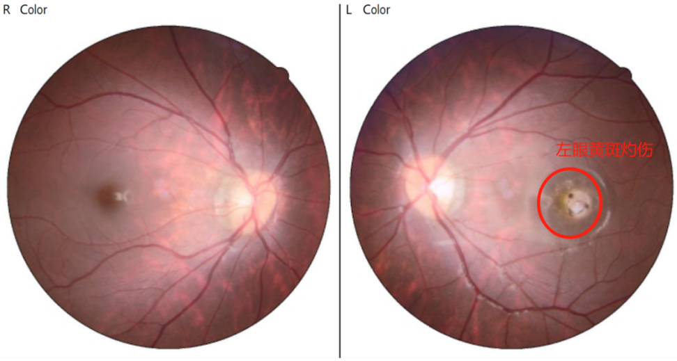 在门诊的深入沟通中,小琴回忆起上学期物理课上的一次经历:老师曾用激光笔演示光学反射原理,并特意提醒同学们不要追视激光笔。然而,出于一时的好奇,她还是忍不住盯着看了两三秒。当时并未感到任何异常,但两三天后,她开始觉得视线模糊,以为是近视加深,并未特别在意。后来由于视物模糊没有改善,看黑板吃力,眼睛越发容易疲劳,她才告知妈妈自己视力下降,想要去配新眼镜的想法。
