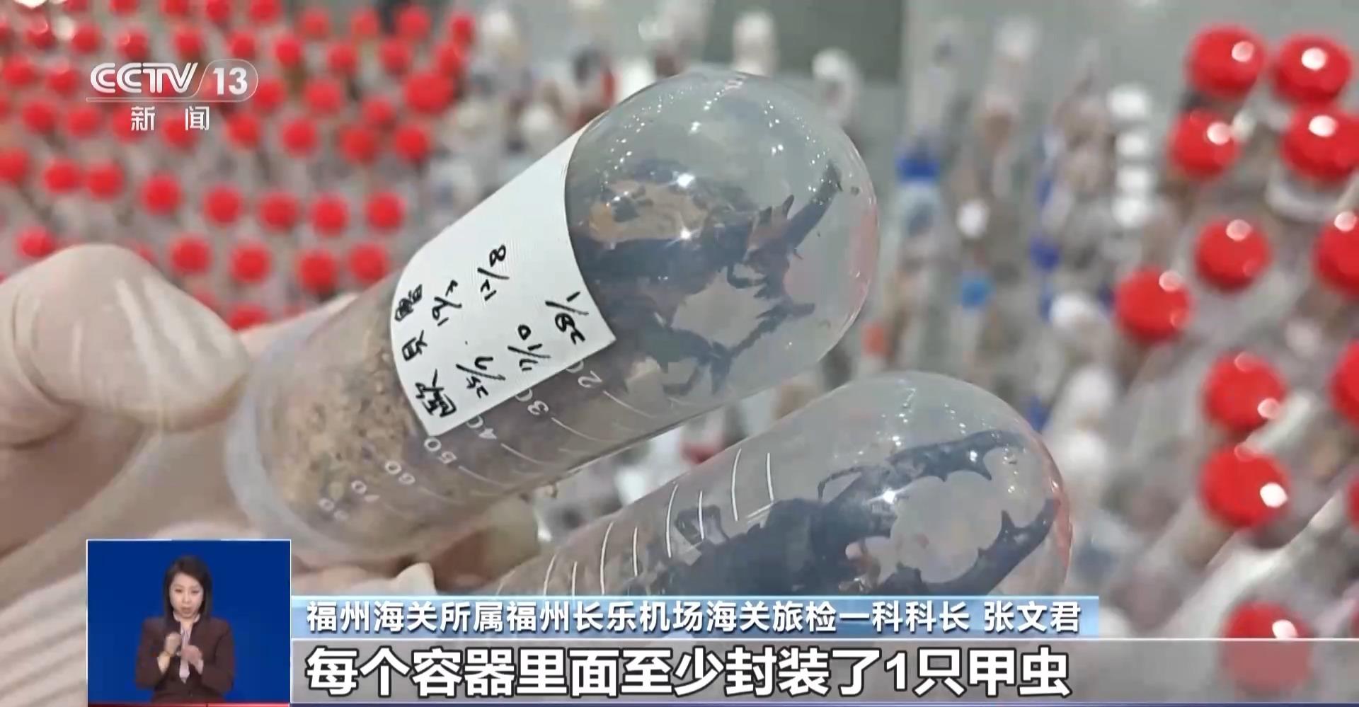 福州海关所属福州长乐机场海关旅检一科科长 张文君:箱子里都是装有甲虫的塑料盒和塑料试管,他的随身背包里也是这些东西。每个容器里面至少封装了1只甲虫,我们现场清点了一下,一共有各类容器410件。