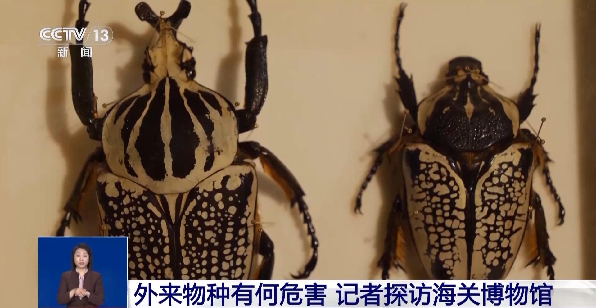 在这里记者看到了海关从入境邮件中截获的白纹大角金龟,堪称昆虫界的巨无霸,它是一种杂食性的昆虫,可以吃掉植物上的叶片、果实、花朵和根部,影响植物的生长,甚至会导致植物的死亡,所以在一定程度上会影响当地生态系统的平衡性。