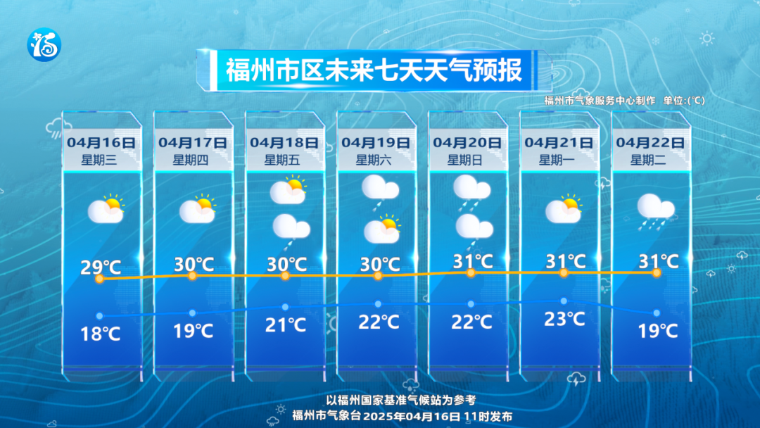 福州未来一周气温十分平稳,最高气温基本稳定在30℃左右,少见的“一字型”气温走势。低温也基本在20℃以上,白天气温高,天气闷热,出门要做好防晒。今明两天气象火险等级高,要格外注意用火和用电安全。