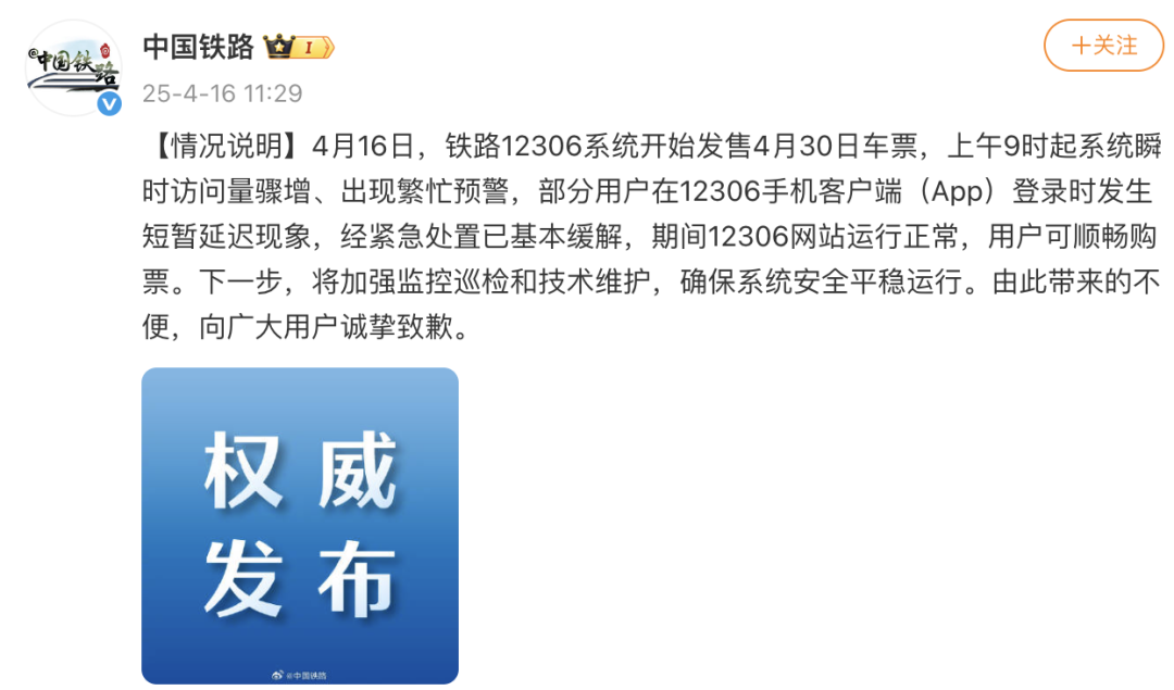 4月16日,铁路12306系统开始发售4月30日车票。上午9时起,系统瞬时访问量骤增,出现繁忙预警,部分用户在12306手机客户端(App)登录时发生短暂延迟现象。经紧急处置已基本缓解,12306网站运行正常,用户可顺畅购票。下一步,将加强监控巡检和技术维护,确保系统安全平稳运行。由此带来的不便,向广大用户诚挚致歉。