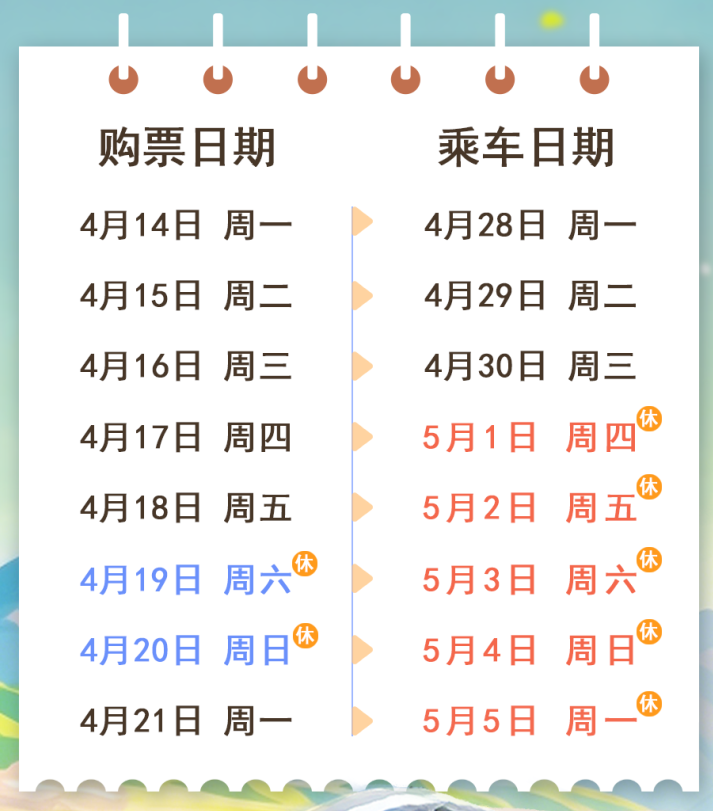根据中国铁路发布的“五一”假期购票日历,17日可买5月1日火车票。