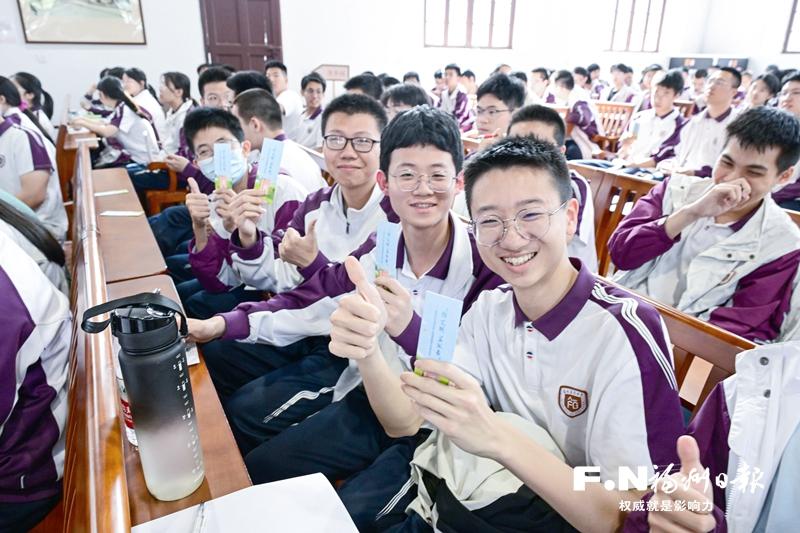 当天首场活动走进福州高级中学,福建医科大学健康管理学院院长林贤浩为高三学生们带来了以“微笑面对人生大考”为主题的讲座。现场通过案例分析和互动,让学生们掌握学习压力调节方法,引导他们微笑应试。“这场讲座就像‘及时雨’,临近高考,林老师用生动幽默的方式,教会了我们如何正确舒缓迎考的压力。”高三学生林诗琪说。