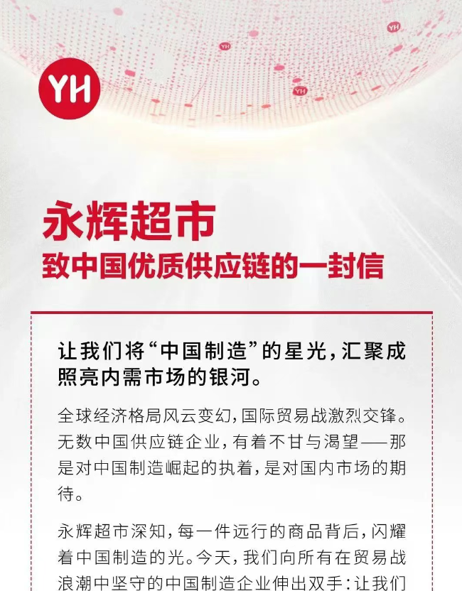 4月7日,永辉超市发布《致中国优质供应链的一封信》,宣布开通绿色通道,提出15天极速上架、品牌推广扶持、联合开发新品三大措施,为出口受阻企业搭建内销桥梁。