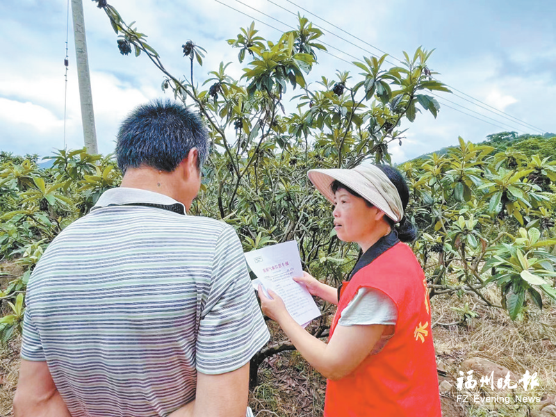 气象局工作人员为果农提供枇杷低温冻害气象指数保险数据参考。永泰县气象局供图