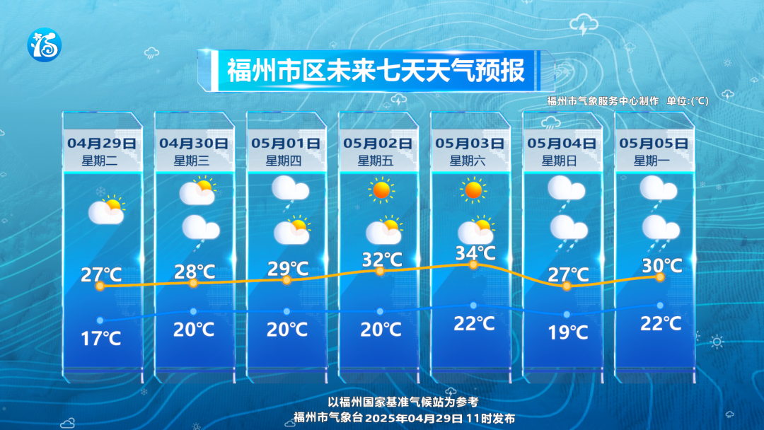 眼下进入升温通道,气温稳步上升,从4月29日起到5月3日福州市区最高气温将会逐步升至34℃,最低气温也会升至20℃左右,体感稍热。5月4日气温将会有所下滑,请根据气温的变化适当增减衣物。
