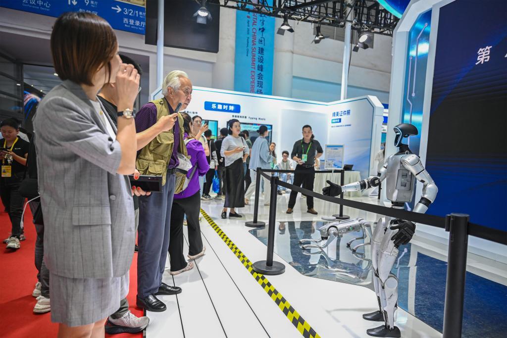 4月28日,观众在第八届数字中国建设峰会现场体验区与机器人互动。新华社记者 周义 摄