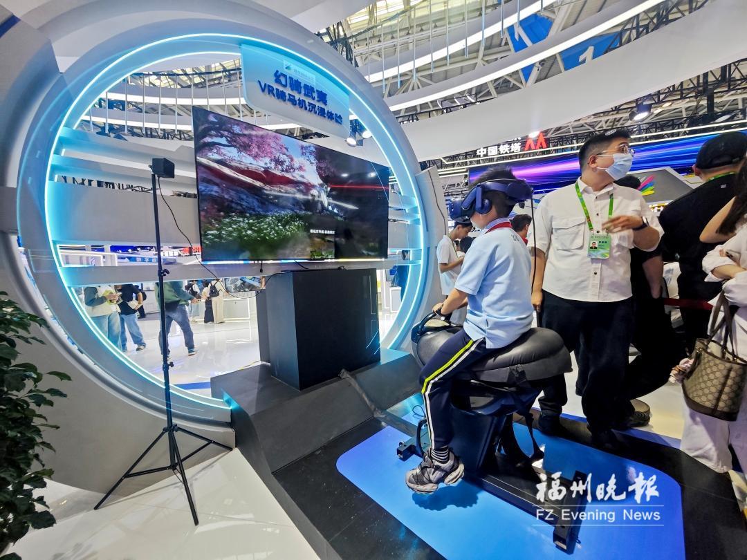 其中,“幻骑武夷·漫游九曲”是数字文旅示范区重点展示的项目之一。一名来自外国的观展者骑上“VR骑马机”,“策马穿行”于武夷山云雾缭绕的生态茶园。接着,蝴蝶化作了仙女引导她进入九曲溪、玉女峰。这样的奇幻体验让她惊叹不已。(记者 陈丹/文 石美祥/摄)