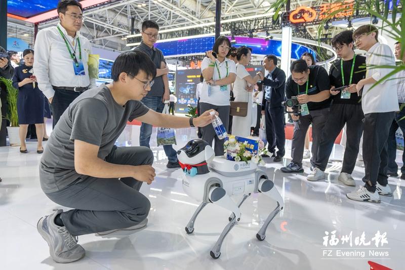 市民在中国移动展区与机器狗互动。