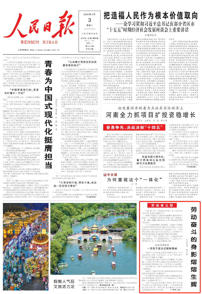 5月3日,《人民日报》头版还关注了全国劳动模范——来自福建省马尾造船股份有限公司集配部管加作业区电焊班班长吴泽平。