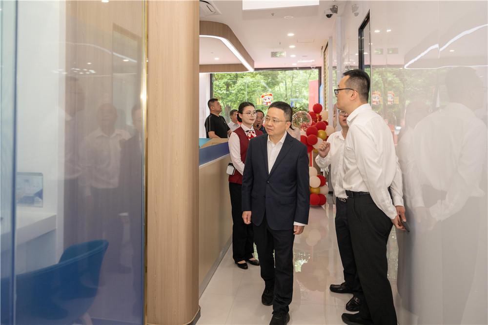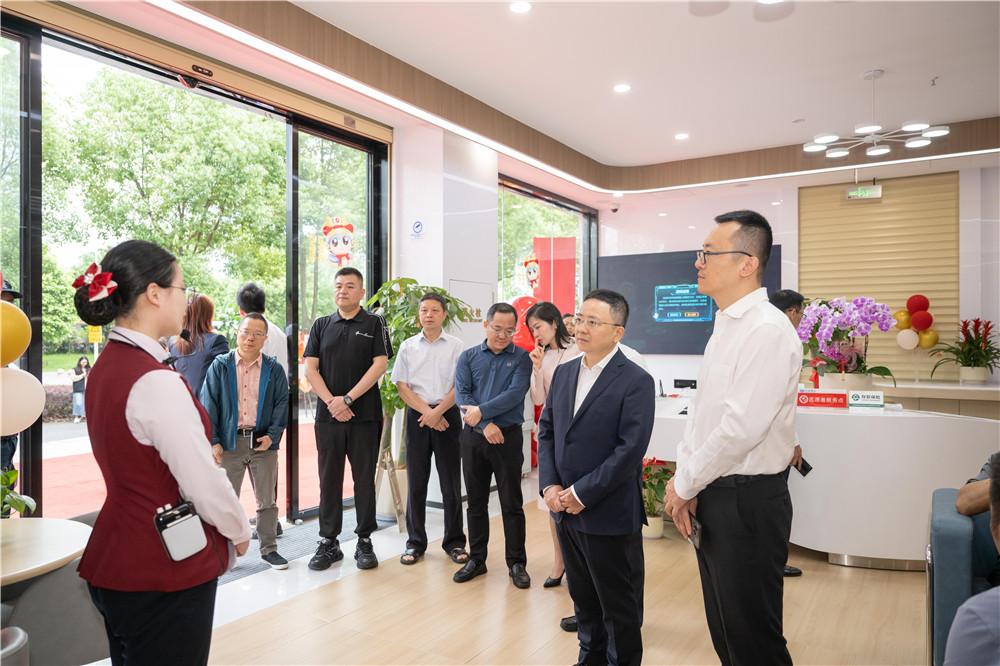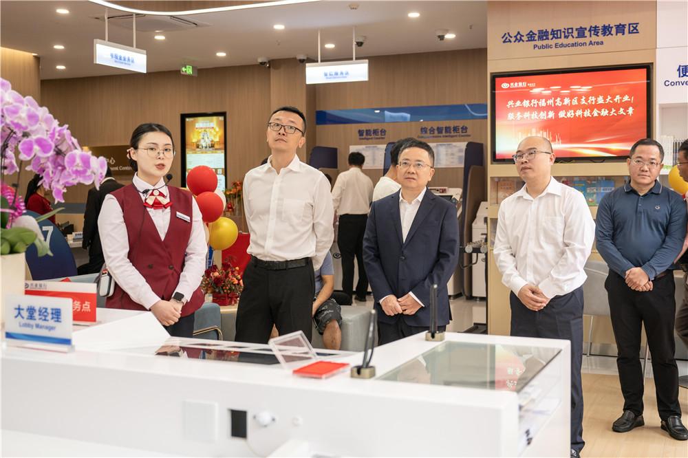 揭牌仪式结束后,领导嘉宾们参观了高新区支行。近期投入运营的兴业银行福州高新区支行位于闽侯县上街镇高新大道6号,毗邻福州高新区行政(市民)服务中心。网点内除了可办理常规的金融业务外,还配置了充满科技感的智慧互动屏,可展示与科创企业相关的全生命周期产品和服务,并通过游戏互动等方式,作为消保、反诈知识宣传阵地;专门开辟了沙龙活动室,里面可拆分会议桌椅、电子白板、音响等设备一应俱全,可供企业客户前来开展沙龙、路演、产品推广等活动,不仅展现了高新区支行作为科技支行的硬件实力,更生动诠释了“以客户为中心”的服务理念。