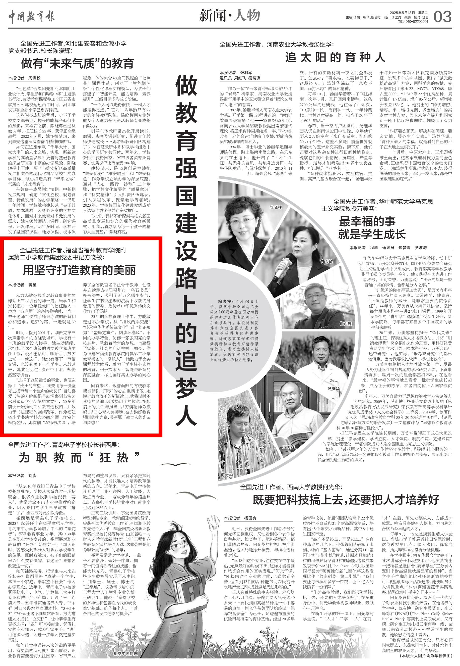 “选择了这份最美的事业,也便选择了‘麦田的守望’,我要用每一份坚守去拔节每一个生命的成长!”自幼喜爱书法的方晓敏很早就洞察到书法艺术对塑造学生品德的重要性,20多年前便开始推动书法教育进校园,并致力于书法课程的创新改革。作为福建省小学书法学科方晓敏名师工作室的领衔名师,她首创“双师书法课”,培养了全省数百名书法骨干教师,创设并连续承办8届福州市“乌石书艺”杯书法赛,吸引了近万名师生参与,让学生在书香墨韵的浸润下收获终身受用的素养,为传承中华优秀传统文化作出了贡献。