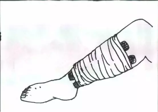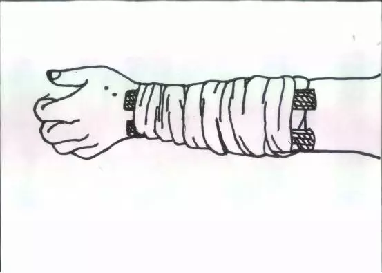 此外,被毒蛇咬伤后,很多人会用布条或者绳子捆绑肢体,怕蛇毒攻心或蔓延。其实捆扎后,每隔20分钟左右,就要放松3~5分钟,避免肢体因缺血而坏死,最后被迫截肢。推荐用小夹板加弹性绷带绑扎的方法,即用木条、绳子或布条等(取长形细木条,上肢用3根、下肢用3~5根)在距离伤口5~10厘米的上端(近心端)处绑扎,以减缓毒素吸收的速度(如示意图)。