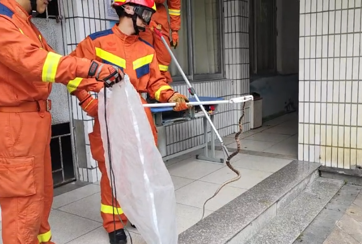 消防救援人员迅速制定抓捕方案,一人用长杆轻轻驱赶蛇,另一人用捕蛇夹夹住了蛇的头部,将其成功捕获。