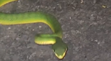 13日晚,市民黄先生在鹤林生态公园遇见了一条竹叶青。据黄先生介绍,这条蛇通体翠绿,尾巴焦红。“是竹叶青,有毒的。”黄先生赶紧避开,远远观察。当时附近人不多,这条蛇在步行道“溜达”一阵后,就“游”进了草坪,和草地融为一体,不仔细看,根本看不到。