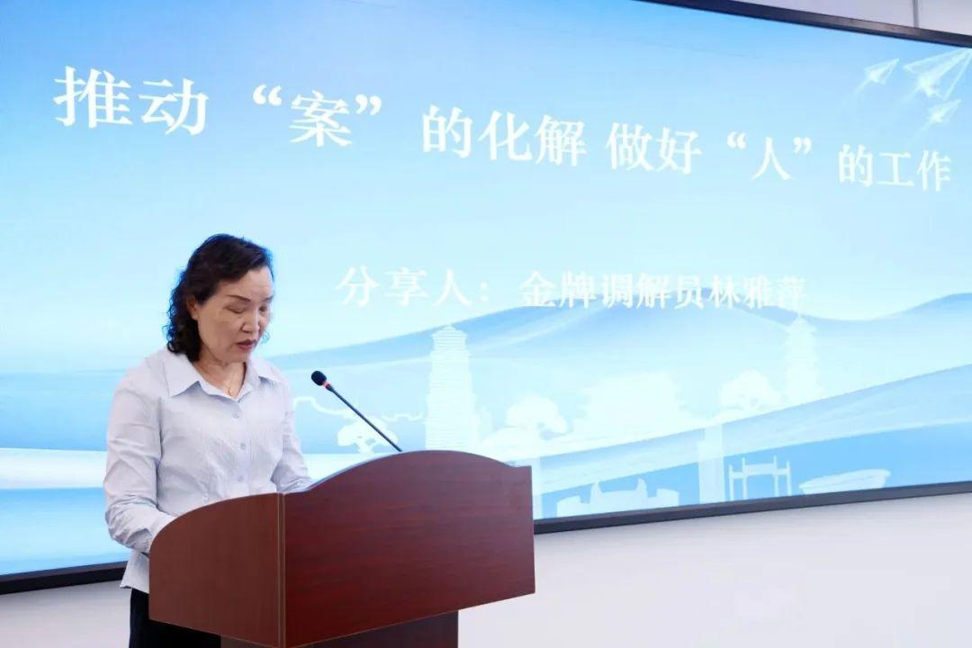市企联林雅萍作为首批特邀调解员,由于在解纷工作中的突出表现,被市中院授予“金牌调解员”称号,并在本次活动中分享调解经验:在某建设工程施工合同纠纷中,涉案双方因长期矛盾僵持不下,她协同法院法官多次介入,从“情理法”多角度出发,为企业算清“经济账”“长远账”。她深知“信任是调解的基础”,凭借企联的桥梁纽带作用赢得双方认可,最终促成“一揽子”和解协议,助力两家榕商企业握手言和,重寻合作机遇,彰显了企联在协同解纷中的独特价值。
