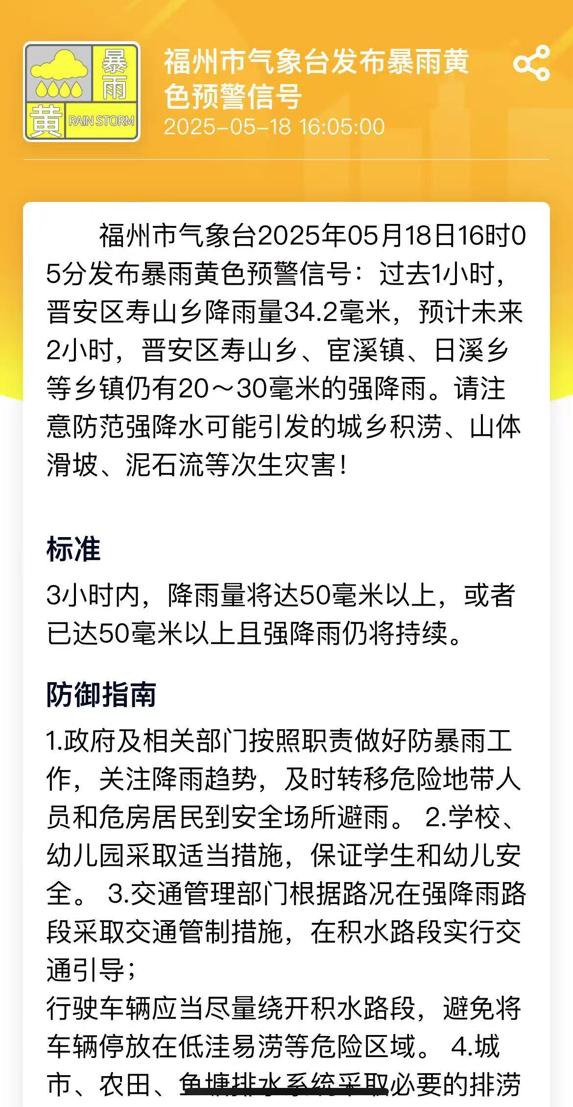 福州市气象台2025年05月18日16时05分发布暴雨黄色预警信号:过去1小时,晋安区寿山乡降雨量34.2毫米,预计未来2小时,晋安区寿山乡、宦溪镇、日溪乡等乡镇仍有20~30毫米的强降雨。请注意防范强降水可能引发的城乡积涝、山体滑坡、泥石流等次生灾害!