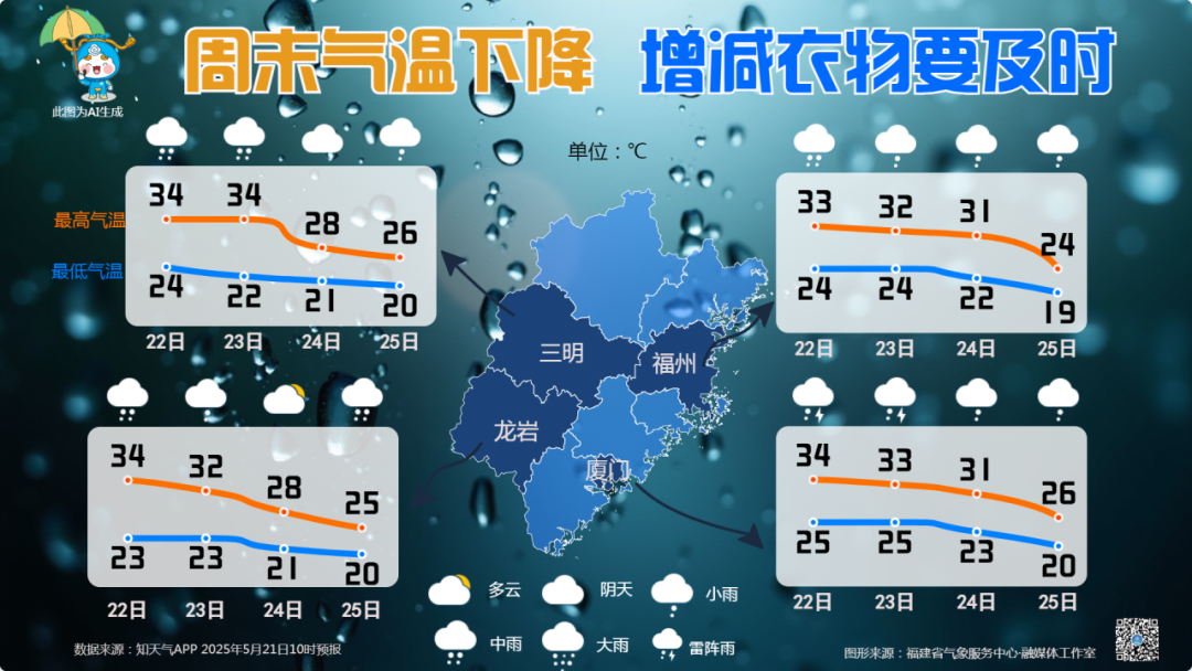 未来三天,福建还是潮湿闷热,白天午后最高气温大多在30℃以上,周末随着冷空气到场,气温将有所下滑。到了周日,最高气温回落至25℃上下,凉爽舒适。