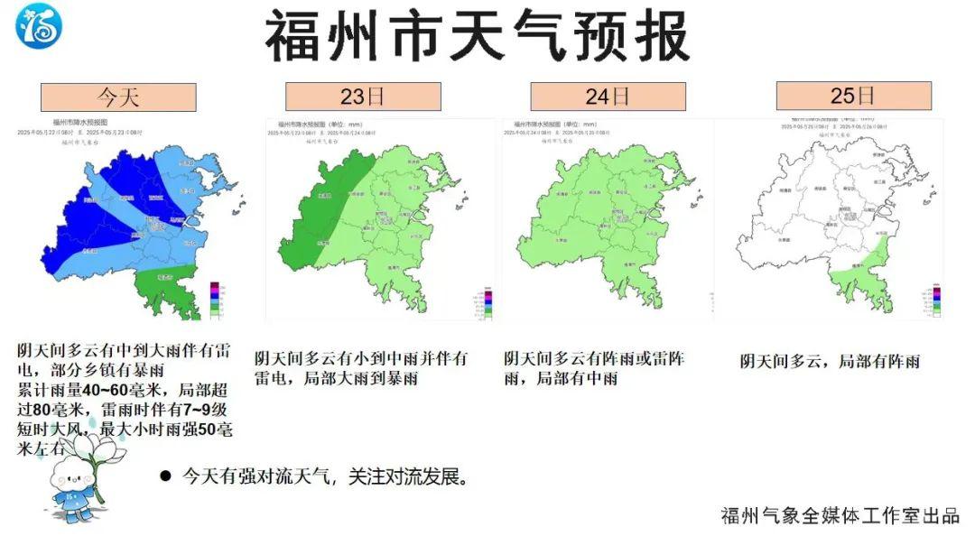 22日午后到夜里有中到大雨并伴有雷电,部分乡镇有暴雨(最大落区为:晋安、马尾、高新、连江、罗源、闽侯、闽清和永泰;累计雨量40~70毫米,局部超过90毫米;最大小时雨量60毫米)。