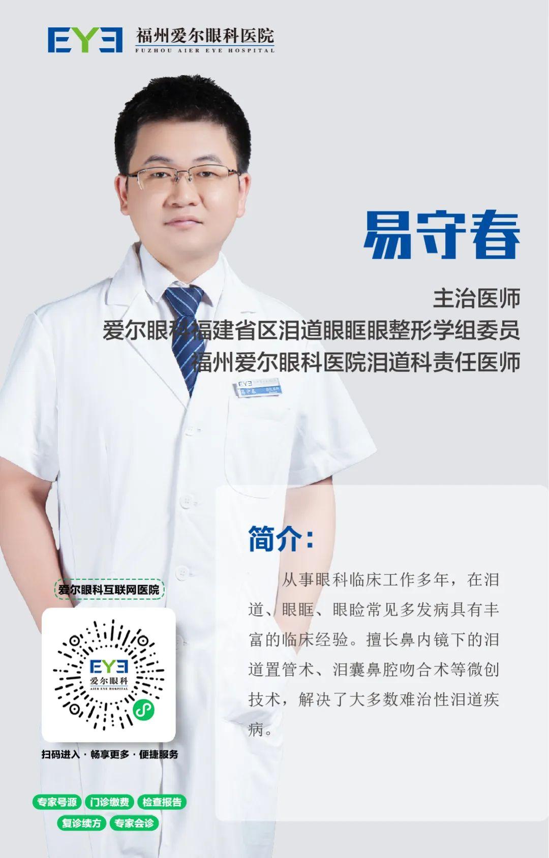 2017年,易守春医生正式加入爱尔眼科,历经多科室的轮转历练后,他的目光与热情最终聚焦于泪道眼眶眼整形这一独特的亚专业。