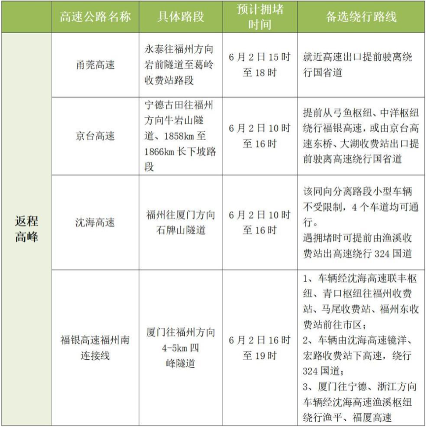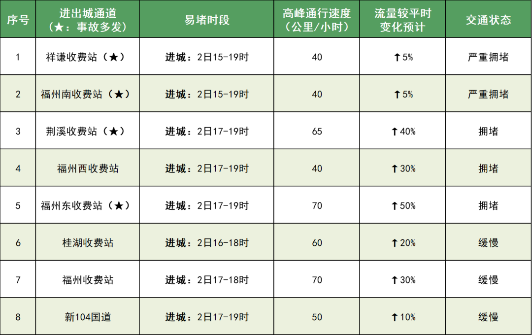 假期最后一日返程高峰时,大车流进入福州市区,高地衔接处易发生拥堵,进城高速收费站如祥谦、福州南等收费站可能出现排队缓行现象。